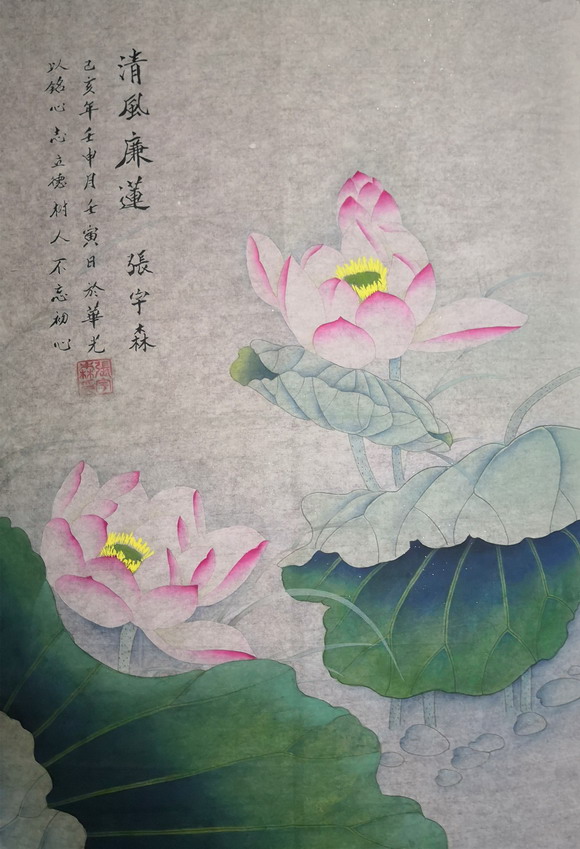莲出淤泥而不染,濯清莲而不妖。张宇森老师说,本画作取材于微风轻拂的莲花,寓意君子清正廉洁、洁身自好,其品德像莲花一样清香远溢。自幼学习书画的他希望通过此画,时刻警醒自己作为一名年轻的共产党员、高校思政辅导员,无论在何时何地都要始终保持最纯洁的初心,牢记使命,严于律己,踏实做事,努力工作。