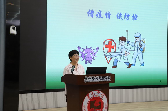 开幕式后,健康管理学院常务副院长刘小玲向大家讲授《借疫情,谈防控》的健康知识讲座,用专业生动的实验案例讲解了疫情防控期间勤洗手、戴口罩等的重要性。