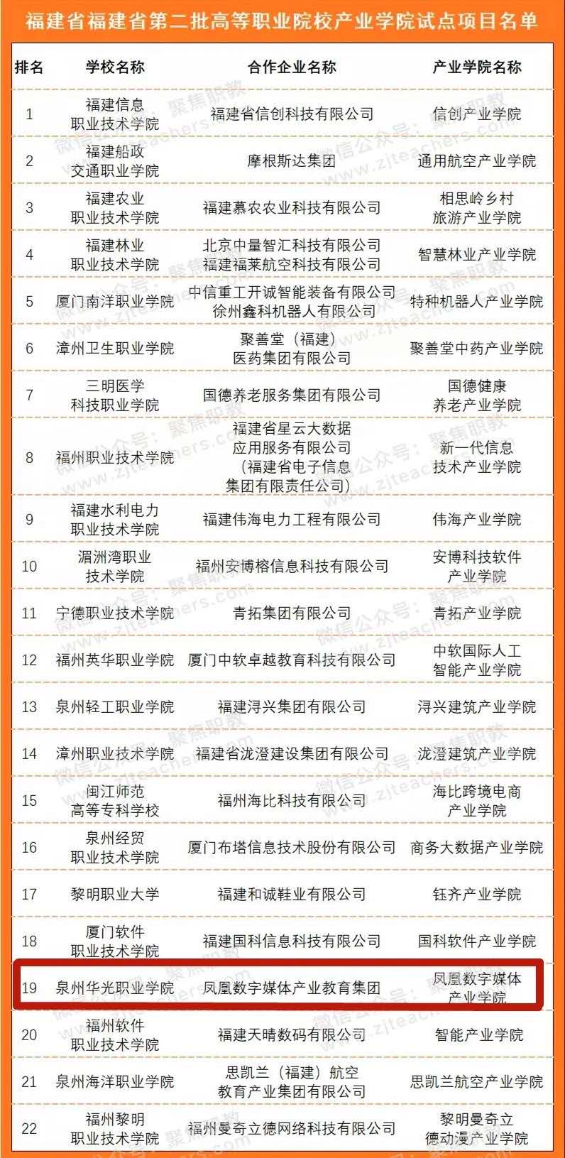 为贯彻落实《福建省人民政府办公厅关于深化产教融合十五条措施的通知》(闽政办〔2018〕94号)关于“鼓励企业与应用型本科高校、职业院校合作共建非独立法人的产业学院”精神,根据《福建省教育厅办公室关于做好福建省第二批高等职业院校产业学院试点申报工作的通知》(闽教办职成〔2020〕13号)要求,经高职院校自主申报、设区市教育局审核,我厅组织专家评审,拟确定福建信息职业技术学院与福建省信创科技有限公司合作共建的信创产业学院等22个项目(名单见附件)为福建省第二批高等职业院校产业学院试点项目,现予以公示。如有异议,请于公示期内向我厅职成处反映。