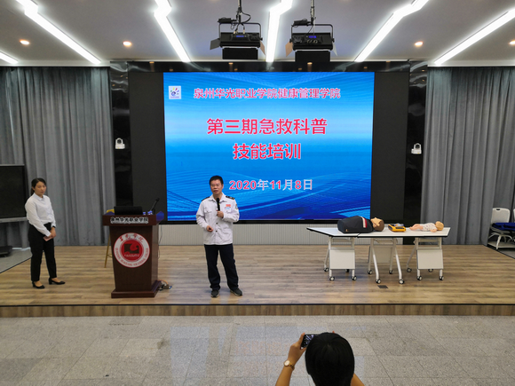 当意外事件突发,生命即将逝去,如何在“黄金时刻”获得及时、有效的救助,是重燃生命之火的关键。为了让广大师生学会急救的基本知识,能在关键时刻展开自救和互救,我院与泉州急救中心定期联合主办公益急救科普培训活动。2020年11月8日,健康管理学院在泉州华光职业学院举行第三期大型急救科普培训活动。急救科普培训分为理论学习和实操两部分。11月8日上午在摄影大楼智慧教室举行急救科普培训理论学习;11月8日下午在行政楼五楼举行急救科普培训实操。泉州急救中心培训科主任陈荣明和35位助教志愿者指导210位参训全体师生急救技能实操。理论与实操相结合,让学员更好掌握急救技能技术。生命因你而精彩,一起演绎非凡人生!