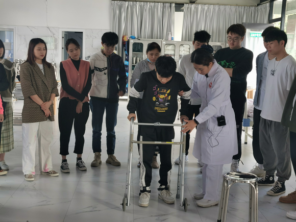 李明洋老师从老年人更换纸尿裤、为高热老年人进行温水擦浴降温、餐具的煮沸消毒法、指导肢体障碍的老年人学习步行器四个授课主题内容进行老年人基础护理讲解。教学基本功扎实,示范准确到位,教学语言简洁清晰,富有吸引力,积极引导学生参与教学活动。实操类课程需要学生积极实际操作。只是学、看还不够,需要通过多次重复操作练习才能操作更顺畅更熟练。学生学习热情高,积极模仿老师的示范进行实操。