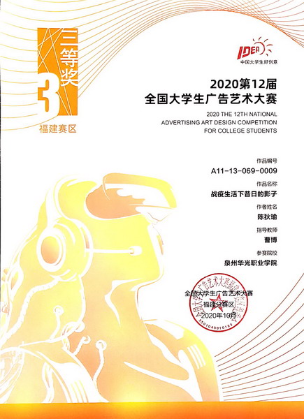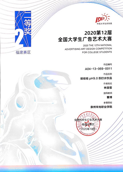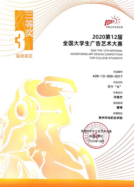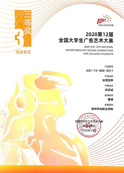 近日,福建省教育厅公布了第十四届福建省大学生学科技能竞赛获奖名单,其中我校参赛学子获得第十二届全国大学生广告艺术大赛福建赛区一等奖1项、二等奖1项,三等奖4项,优秀奖13项的优异成绩。