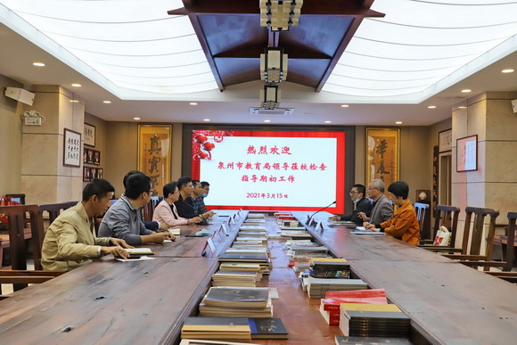 3月15日下午,泉州市教育局四级调研员、市教育工会主席谢细财,市教育局四级调研员纪如和规划建设科副科长洪玮玮一行莅临我校检查指导2021年春季疫情防控和期初教学工作,我校校长陈雅芳、党委书记吴颖芳及有关处室负责人参加调研会。