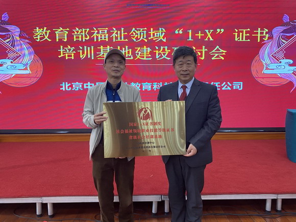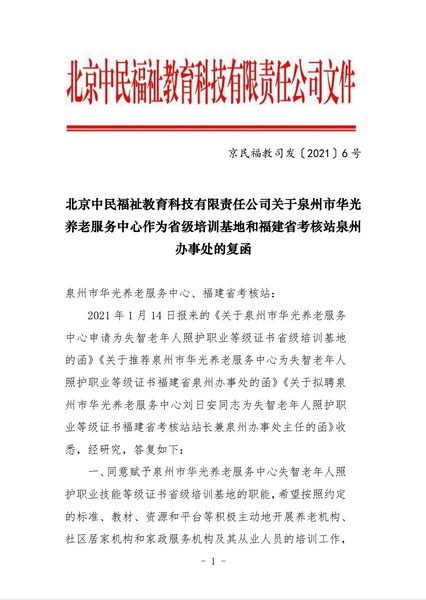 北京中民福祉教育科技有限责任公司是民政部培训中心直属的国有企业,教育部遴选认定的第二批、第四批1+X培训评价组织。今年1月18日,该司以(京民福教司发【2021】6号)文批复同意我校华光养老服务中心作为失智老年人照护职业技能等级证书省级培训基地,同时聘任刘日安为福建省考核站常务副站长兼泉州办事处主任。