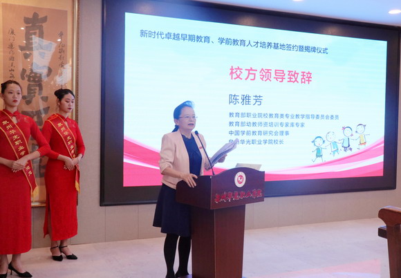 陈雅芳校长发表讲话,她首先代表学校向幼乐美公司以及参加会议的幼儿园、亲子园园长表示感谢,对双智慧实训室的成功落地表示祝贺,她强调校企合作是职业教育高质量发展的必由之路,校企双方要秉持“资源共享、责任共担、互利双赢、共同发展”原则,共同推动产教融合、协同育人合作项目的深入开展,形成人才链、专业链、教学链的融合共同体,共同为早期教育、学前教育培养培训人才。