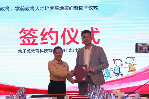 幼乐美陈洪秋董事长作为企业代表发言,他简要介绍了公司的发展情况,幼乐美公司作为全国学前教育产教合作联盟牵头单位,一直致力于推动校企联合,深化校企合作。陈董事长表示在教育部教指委和全国学前教育产教合作联盟的指导下,幼乐美教育与泉州华光职业学院会依托早期教育、学前教育智慧型实训基地,将在学前教育、早期教育专业岗位能力、教师资格证对接、全国学生技能大赛等方面做“岗证赛”课程融合体系建设,以平台为载体“建好、用好、研好”推动产教融合,共同培养学早期教育、前教育专业双师型师资队伍,从产、教、学、研、用五个维度支撑学校早期教育和学前教育专业内涵建设。