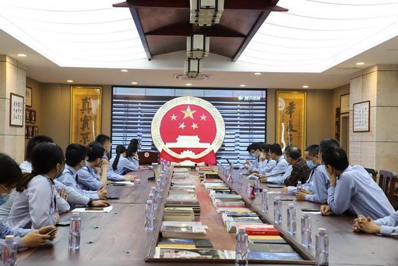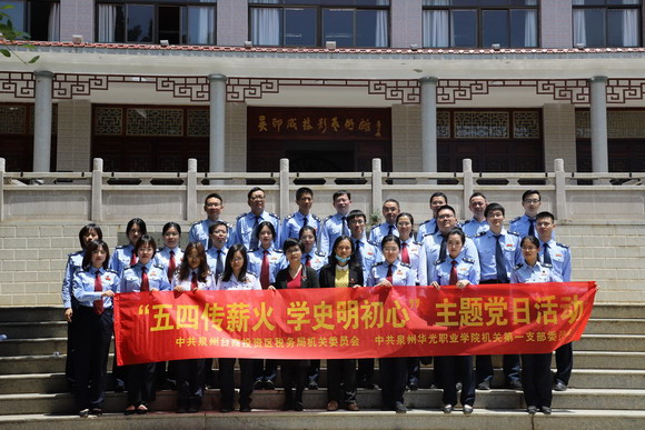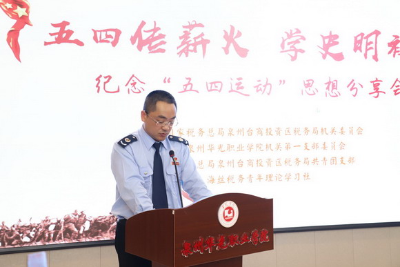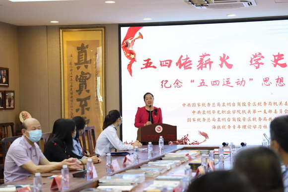 4月30日上午,在五四青年节到来之际,泉州台商投资区税务局青年理论学习社全体干部及辅导导师一行三十余人莅临我校共同开展“五四传薪火、学史明初心”主题党建活动。税务局党委委员、纪检组组长高华达,党委委员、副局长蔡斌伟,党委委员、副局长黄华泽,四级高级主办李少彬等领导,我校党委书记吴颖芳,总会计师黄金华,党委宣传部负责人、机关第一党支部书记以及财务处负责人参加活动。