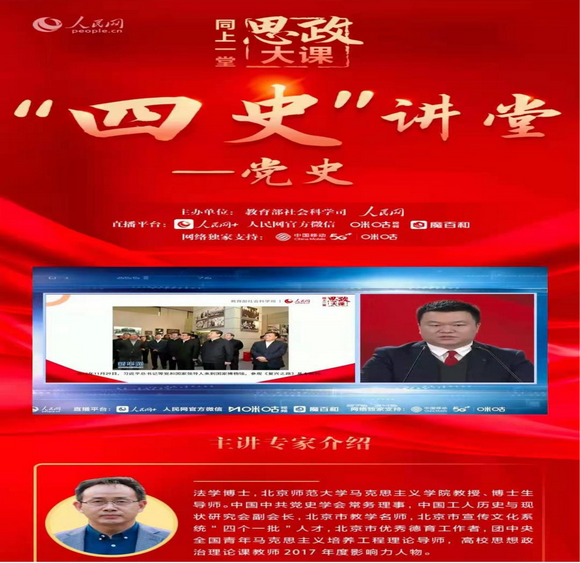 为深入贯彻落实习近平总书记关于深化思想政治理论课改革创新和“大思政课”的重要指示批示精神,全面落实习近平总书记在党史学习教育动员大会上的重要讲话精神和《中共中央关于在全党开展党史学习教育的通知》的部署安排,教育部社科司与人民网联合举办“同上‘四史’思政大课”活动。