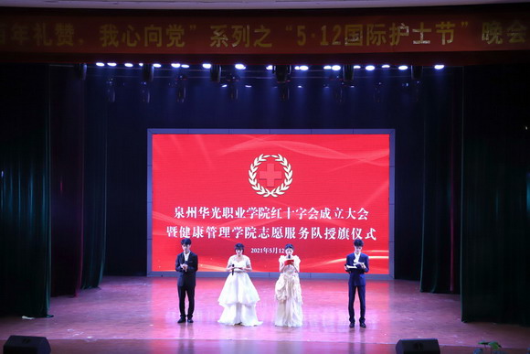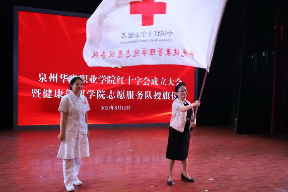 泉州华光职业学院红十字会成立大会暨健康管理学院志愿服务队授旗仪式在奏唱国歌中拉开帷幕。副校长崔荫上台致辞。崔副校长希望同学们能够借助红十字会这一平台大力弘扬人道、博爱、奉献精神,把自己初步培养为服务的高手、实践的能手、交流的巧手,把中华民族孝悌仁爱的优良传统与国际红十字会基本原则结合起来,把传播红十字会精神与培养践行社会主义核心价值观结合起来。