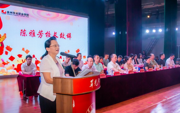 陈雅芳校长发表致辞,她细数三年来学校的跨越和发展,同学的超越和蜕变,对毕业生们致以热烈的祝贺和诚挚的祝福,本届毕业生中有82人获得优秀毕业生称号,73人光荣地加入中国共产党,参加各级各类职业技能竞赛45项,可谓荣誉满满。她说,今年正值中国共产党百年华诞,希望同学们汲取百年积淀的精华作为人生前行的养分,一要坚定信仰,牢记使命;二要不懈奋斗,自强进取;三要不忘初心,爱拼敢赢,“立志跟党走,人生勇拼搏”。