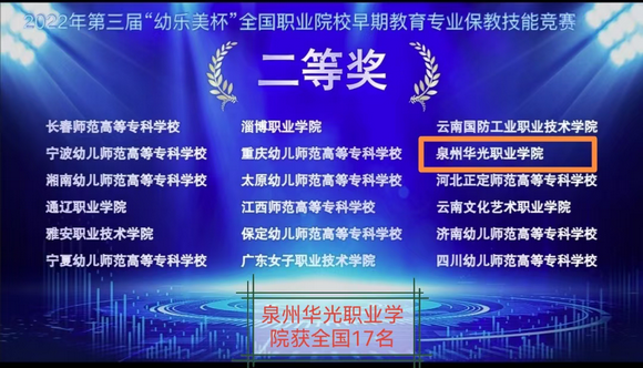 11月18日上午,2022年第三届“幼乐美杯”全国职业院校早期教育保教技能竞赛在线上拉开帷幕。泉州华光职业学院教育学院吴亚楠、麻卢双和黄诗颖三位学子组成保教技能队伍参赛,经过激烈角逐,荣获全国早期教育保教技能赛项二等奖。
