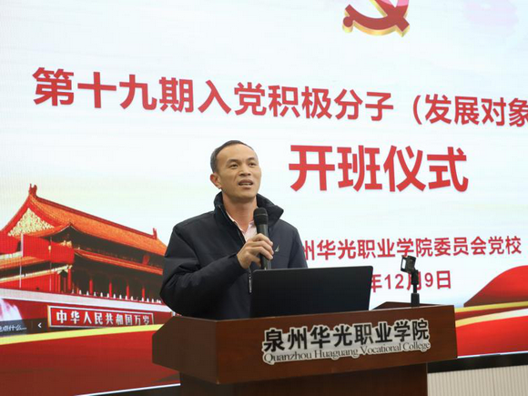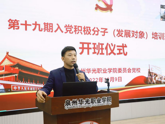 为深入学习贯彻党的二十大精神,扎实做好党员发展工作,提高入党积极分子和发展对象的政治思想素质和理论水平,把好党员“入口关”。12月9日下午,泉州华光职业学院党校第十九期入党积极分子(发展对象)培训班开班仪式在摄影大楼智慧教室通过线上线下相结合的方式顺利举行。党委副书记陈雄华出席开班仪式并作动员讲话,各党支部书记及全体党校学员参加开班仪式。仪式由党委委员、党委办公室主任何立主持。