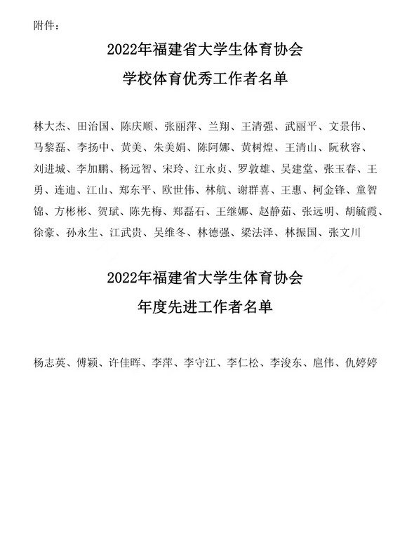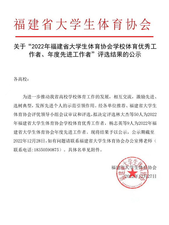 福建省大学生体育协会为推动我省高校体育工作,发挥先进典型的示范、激励、强化作用,于近日在我省近百所高校几千名高校体育教育工作者中组织开展了 2022年“福建省大学生体育协会学校体育优秀工作者”评选工作。经过严格的评选工作程序,评选出50位学校体育优秀工作者,我校黄树煌老师脱颖而出,荣获福建省大学生体育协会学校体育优秀工作者的表彰。