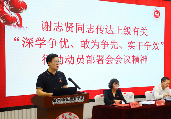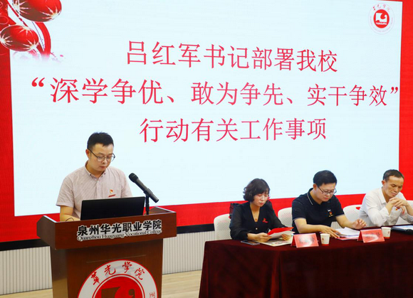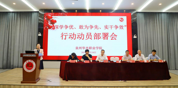 陈雅芳校长作动员讲话,对扎实推进我校“深学争优、敢为争先、实干争效”行动提出三点意见:一是深学争优,争当理论武装的“优秀生”。要结合习近平新时代中国特色社会主义思想主题教育,紧紧围绕学校135工程项目规划建设蓝图,认真领会《关于深化现代职业教育体系建设改革的意见》精神,走好我校“职普融通、产教融合、科教融汇”特色之路;二是敢为争先,争当敢拼会赢的“先行者”。要树立“干事争先”的拼搏精神,弘扬“马上就办、真抓实干”的优良作风,牢固树立“尽早尽快”理念,迅速吹响“开局就要争先”的工作冲锋号,全力以赴、心无旁骛做好学校“双元三全六化育人”工作,为福建省培养更多的技术技能人才做出华光贡献。三是实干争效,争当务求实效的“实干家”。要把“效”体现在提升育人工程、师资工程和基建工程上,体现在推动三教改革、深化双教融合、访企拓岗招生就业和推进对外交流上,体现在创建省级文明校园、建设高水平专业群和申报职业教育本科专业试点上,不断提高履职尽责的能力和水平。