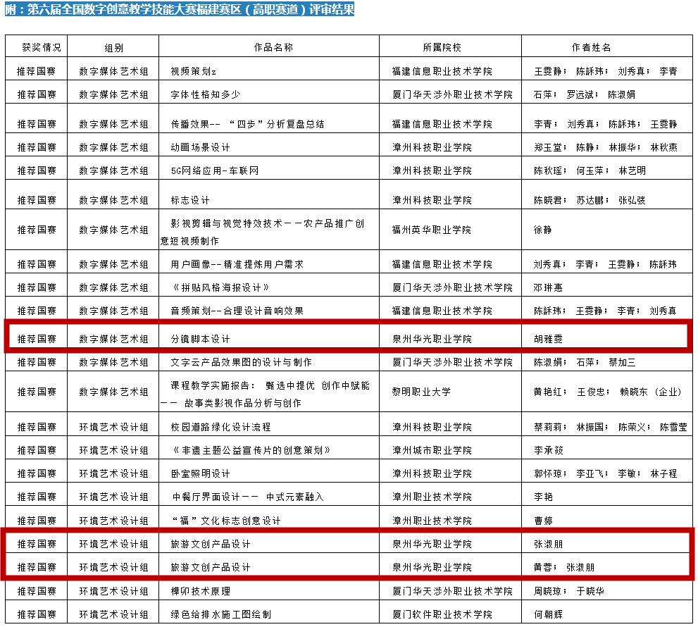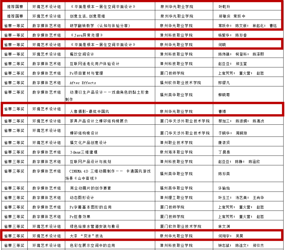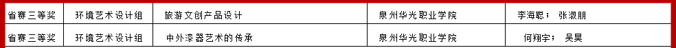 此外,常跃中(团队)《研学翻转教学 (认知与体验分享)》、何晓《平面是根本一居住空间平面设计》获省赛一等奖;曹博《人像摄影--最炫中国风》获省赛二等奖;何翔宇(团队)《大漆 “变涂”技法》、李海聪(团队)《旅游文创产品设计》、何翔宇(团队)《中外漆器艺术的传承》获省赛三等奖。