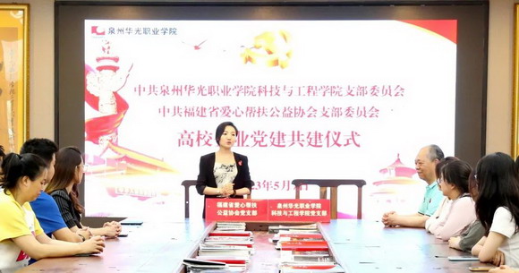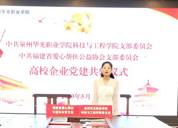福建省爱心帮扶公益协会党支部书记罗雅斯说到:“我代表支部感谢华光学院共同搭建"校企合作"党建平台,这对我们对企业及学校都具有深远的意义。党建共建共享,有助于推动校企的多角度、深层次合作。”