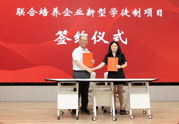 在联合培养企业新型学徒制项目签约仪式上,林述琦副校长与泉州比迪鞋业有限公司王珊珊女士和泉州荣顺鞋业有限公司徐海燕女士上台签约。两个企业800个员工将以中级技工标准由校企共同培养。