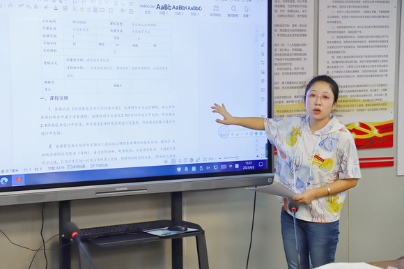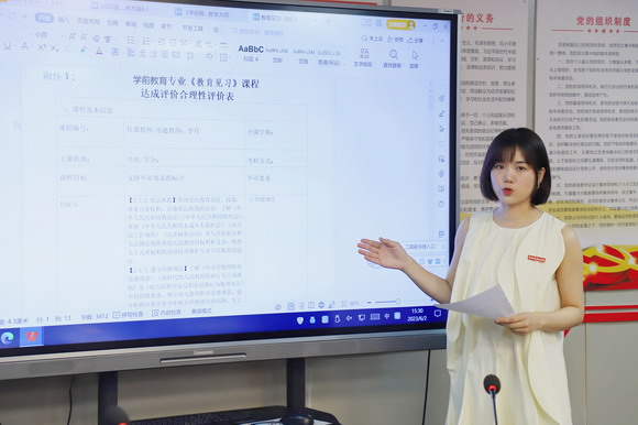 李彦润老师针对《幼儿园班级管理》课程大纲进行解读和分享。教务处处长陈春对达成评价实施细则进行进一步细化讲解,对各目标权重及达成度的计算进行强调。