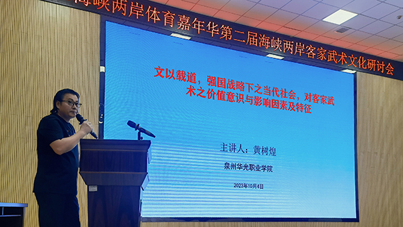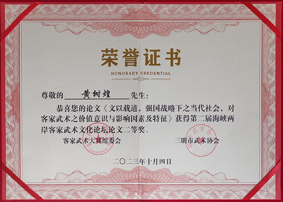 本次论坛以征集全国范围内客家武术文化方面的优秀学术论文,经过组委会专家的严格评审,我校非遗研究院常务副院长黄树煌所撰写的《文以载道,强国战略下之当代社会,对客家武术之价值意识与影响因素及特征》一文荣获二等奖。