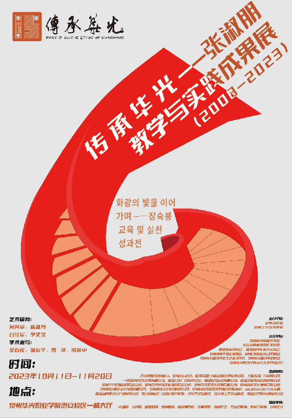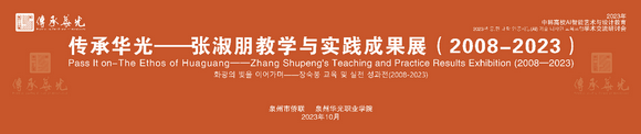 2023年10月11日,泉州华光职业学院工艺美术学院“传承华光”——张淑朋教学与实践成果展(2008-2023)开幕式在惠安校区一楼展厅隆重举行,来自韩国的安世根、全春莲、申政澈、金成浩等四位专家教授,国内高校教授唐文忠、韩志强、江绍雄、张建华、杨海涛、商春玲、黄佳敏等,我校校长陈雅芳、书记吕红军、副校长崔荫,以及工艺美术学院师生参加开幕式。此次展览以思政案例、教学成果、生活礼记和艺术寻梦为主题,展现自2008年至2023年间在艺术设计专业师生取得的优秀教学与实践成果。其中“艺术寻梦”版块还在泉州城东万达广场同时展出,于10月10日下午盛大开幕。展览开幕式还邀请到兄弟院校专业教师、美术和摄影协会等行业专家、优秀校友莅校参观指导。