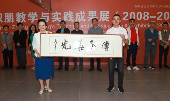 他还向学校捐献了一幅屡获大奖的漆画作品《青州神韵之三》和李文宝教授题字的本次主题《传承华光》。