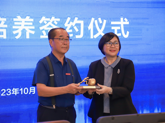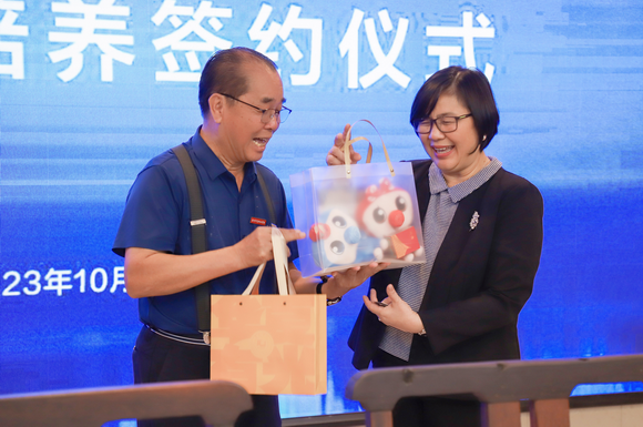 DR.OLGA ANGELINETTA P.TULABUT和吴其萃董事长分别代表两校互赠纪念品。