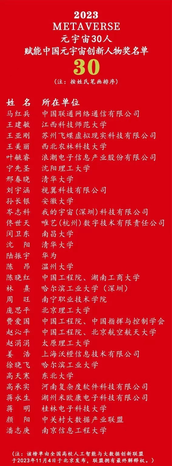 “元宇宙30人”2023赋能中国元宇宙创新人物奖获奖人员名单