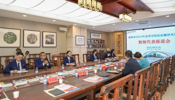 11月15日,以福建卫生职业技术学院党委书记曾武祈为组长的省教育厅专家组一行7人,在省教育评估研究中心副主任王长旺的带领下,莅临泉州华光职业学院开展2023年法治测评实地复核工作,我校在行政楼一楼会议室举行汇报会,理事长吴其萃,校长陈雅芳,党委书记吕红军、副书记陈雄华及相关部门负责人参加会议。