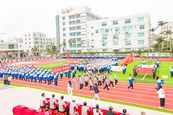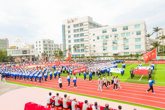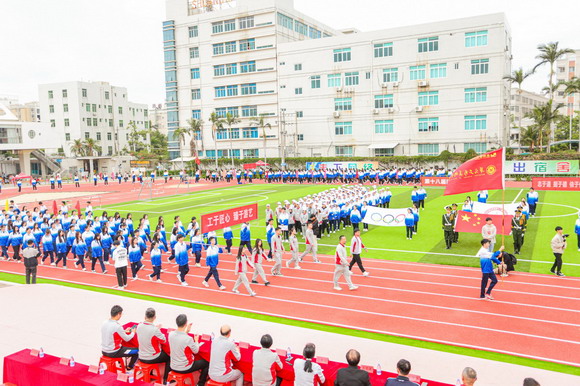 在嘹亮的《运动员进行曲》歌声中,国旗方阵,五环旗方阵,校旗方阵,会徽方阵,校训方阵,彩旗方阵,裁判员方阵,教工方阵,健康管理学院,工艺美术学院,商学院方阵,教育学院方阵,摄影与电影技术学院方阵,科技与工程学院方阵和体育学院方阵依次进入主会场。方阵队列整齐,运动员们精神奕奕、活力满满,青春的气息充满华光校园。