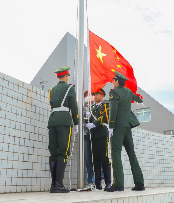 升国旗,全体师生唱国歌。