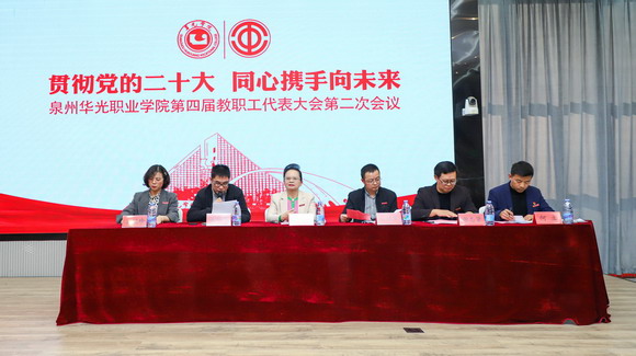 为深入学习贯彻习近平新时代中国特色社会主义思想,全面推进学校民主管理进程,切实履行“维护、建设、参与、教育”四项基本职能,12月29日下午,以“贯彻党的二十大,同心携手向未来”为主题的泉州华光职业学院第四届教职工代表大会第二次会议在摄影大楼智慧教室胜利召开,15位主席团成员、120名教职工代表以主人翁的精神认真审议大会各项议程,发挥代表主力军作用,为学校的发展建言献策。