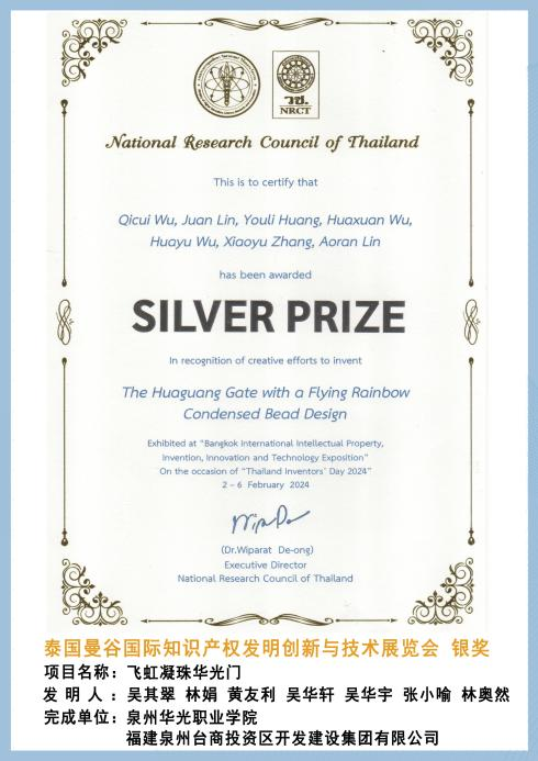 飞虹凝珠华光门以其优雅的形态和拱力学结构,荣获2024泰国曼谷国际知识产权发明创新与技术展览会银奖。