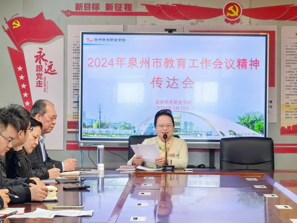 陈雅芳校长传达学习2024年泉州市教育工作会议精神。她表示,学校将深入贯彻落实2024年全国教育工作会议精神、全省教育工作会议精神及泉州市教育工作会议精神,要求各部门要进一步组织学习贯彻、精心安排实施、加强部门协调,抢抓机遇、勇毅前行,为2024年学校事业发展开好局、起好步、谋好篇。