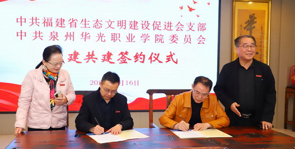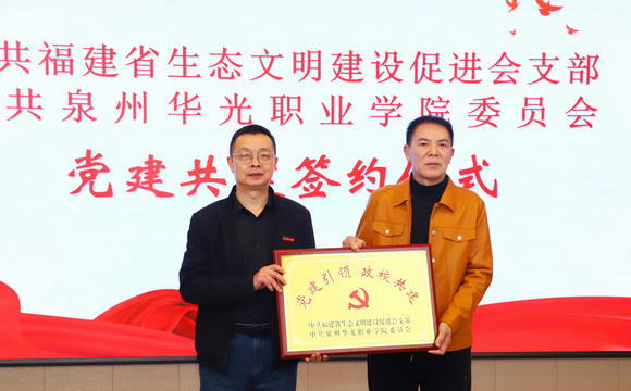 中共福建省生态建设促进会支部与中共泉州华光职业学院委员会缔结为党建共建单位,游厚寿秘书长与吕红军书记签订共建协议,并向我校颁发“党建引领,政校共建”牌匾。