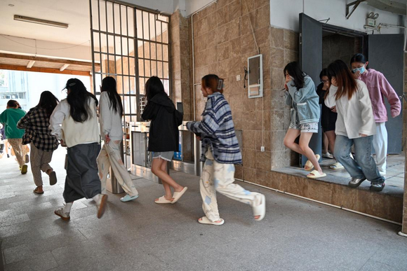 随着急促的警报声在校园内响起,消防安全应急疏散演练正式开始。学生处、保卫处、学院书记和辅导员等相关人员迅速到岗,按照演练预案团结协作、密切配合,组织引导学生捂住嘴鼻,按疏散路线有序地迅速撤离到指定安全区域。