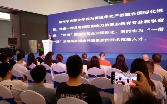 泉州华光职业学院林述琦教授的《职教出海服务国际产能合作》主题演讲:坚持“教随产出、校企同行”,服务国家外交大局,服务国际产能合作,推动职业院校跟随中国企业走出去,打造国际办学品牌项目。