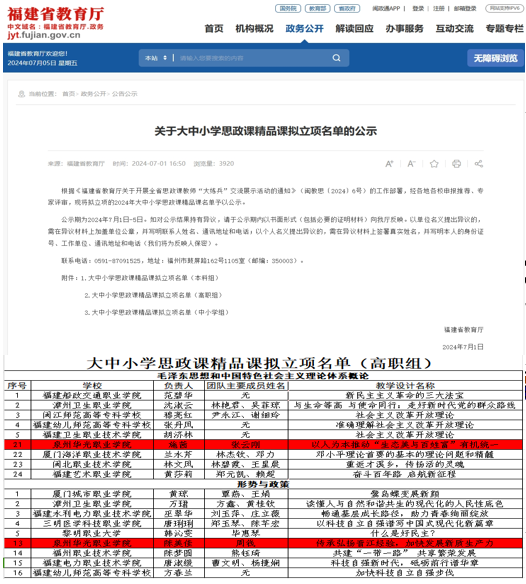 近日,福建省教育厅公布了2024年大中小学思政课精品课立项名单,马克思主义学院施茜老师教师团队的《以人为本推动“生态美与百姓富”有机统一》、陈美佳老师教师团队的《传承弘扬晋江经验,加快发展新质生产力》两个项目获得全省思政课教师“大练兵”交流展示活动思政课精品课立项。