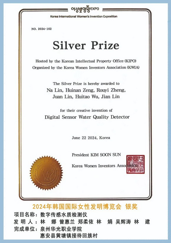 泉州华光职业学院与惠安县黄塘镇接待回族村合作研发的产教融合赋能乡村振兴项目--《数字传感水质检测仪》,由中国发明协会选送参加2024年韩国国际女性发明展览会,荣获国际发明创新银奖。