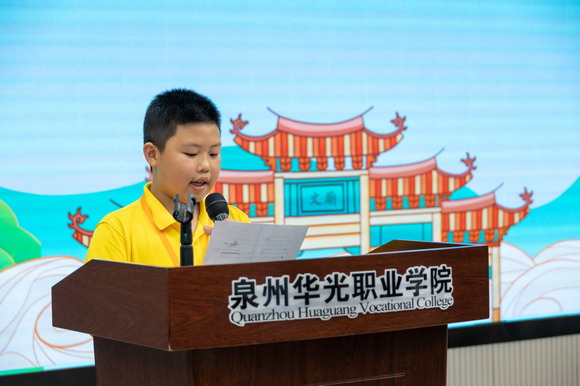 营员代表林煜熙向主办和承办单位、向付出辛勤努力的相关工作人员和热情好客的华光师生表示感谢,他说,本次夏令营活动是一次非常宝贵的中华文化体验机会,很多和想象中、印象中不一样的体验。他在发言中说:我记得在参观德化陶瓷博物馆时,通过导游的讲解才知道,那样精致的瓷器居然是由黑土烧至而成的。我想,无论我们来自何方,无论原本是什么模样,经历过“高温烧制、师傅的细心雕刻”,我们都能成为自己最好的模样。