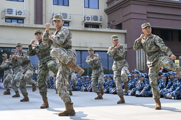 惠安校区的军训教官们现场展示训练操,赢得同学们阵阵掌声。