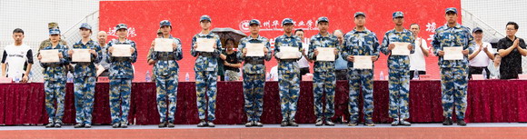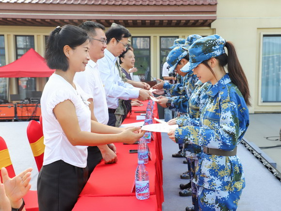 总教官宣布优秀方阵、军训标兵获奖名单,并为获奖方阵代表颁奖。