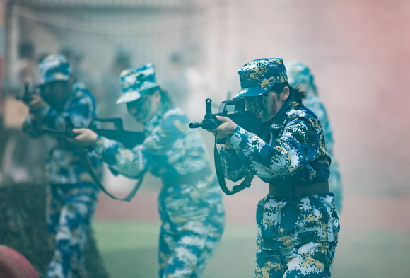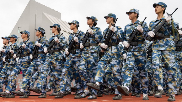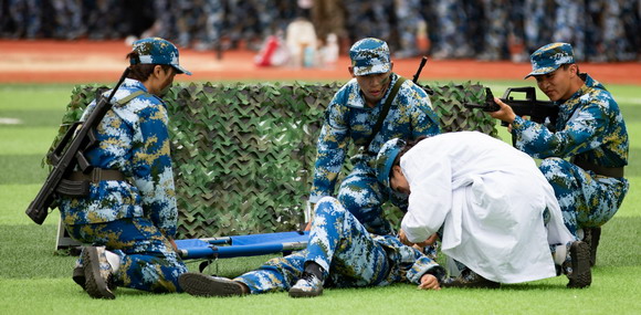 各学院方阵代表队身着戎装,踏着整齐稳健的步伐,进行汇操、表演。军体拳,格斗术,匕首操,模拟枪,刺杀操等表演,赢得了现场热烈的掌声。