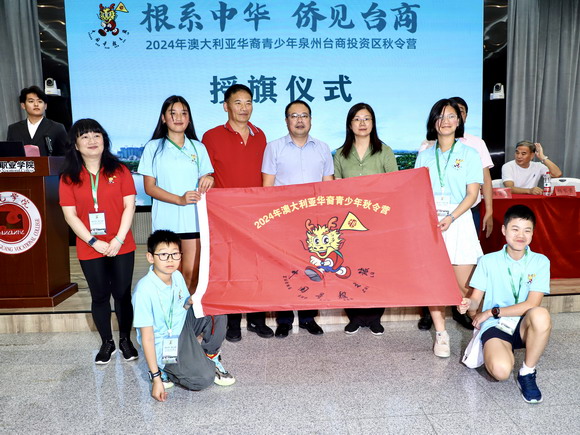 出席活动的领导嘉宾为澳大利亚秋令营领队和营员授旗,象征着本次秋令营活动正式开启