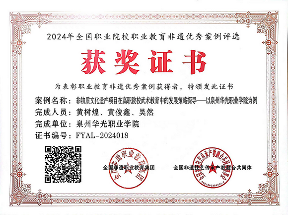 由我校黄树煌老师牵头的非遗项目“非物质文化遗产项目在高职院校武术教育中的发展策略探寻——以泉州华光职业学院为例”,荣获“2024 年全国职业院校职业教育非遗优秀案例”殊荣。