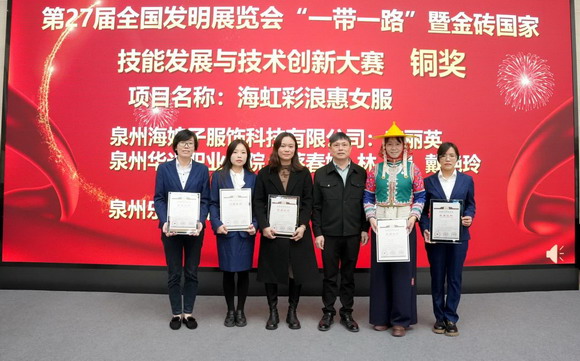 泉州华光职业学院副校长林述琦为国际发明创新银奖获奖者颁发证书。