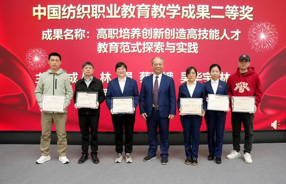 泉州华光职业学院副校长林述琦为中国纺织职业教育教学成果奖获奖者颁发证书。
