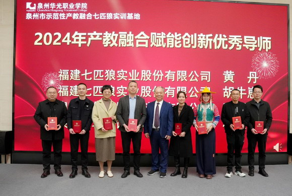 泉州华光职业学院林述琦副校长、产教融合研究院林娟院长,福建七匹狼实业股份有限公司党委书记、董事、执行总裁吴兴群、七匹狼党委罗龙祥副书记,以及安踏、凯通鞋业、海娘子服饰、知守装饰等15家企业代表、华光大蓬车教师与学生和七匹狼公司员工近200人出席表彰大会。