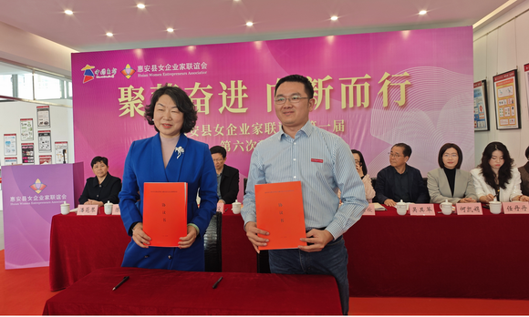 在与会人员的共同见证下,曾国阳主任与惠安县女企业家联谊会会长杨嘉红代表双方签订校企业合作框架协议。