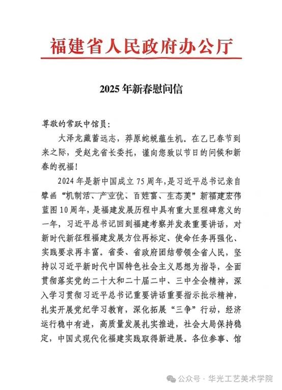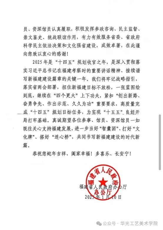 慰问信中还提到,2025年是“十四五”规划收官之年,是深入贯彻落实习近平总书记在福建考察时的重要讲话精神、接续谱写新福建建设篇章的关键一年。我们将牢记战略指引,落实省两会部署,扭住新福建目标不放松,一张蓝图绘到底,继续在“四个更大”上下功夫,紧扣“创出新路、奋勇争先、作出示范、久久为功”重要要求,高质量完成 “十四五”规划目标任务,为实现“十五五”良好开局打牢基础。真诚期望各位参事、馆员、资深馆员一如既往关心支持福建发展,进一步当好“智囊团”、打好“文化牌”、搭好“连心桥”,共同书写新福建建设的时代新篇。