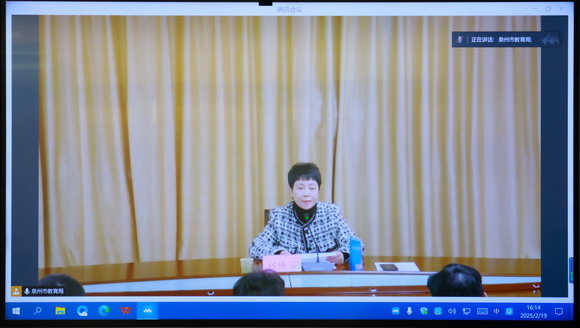2月19日下午,泉州市教育局召开2025年全市教育工作会议,全面总结2024年全市教育工作成果,部署2025年重点工作任务。本次会议采用线上线下相结合的方式,泉州市教育局局长刘殊芳出席并发表重要讲话。我校在中区行政楼三楼会议室设立分会场,全体校领导及办公室、党办、教务处、学生处、人事处、招生办、资产与财务处、科研处、后勤处、信息化与实训中心及华光幼儿园等各部门负责人参会,共同聆听并学习会议精神。